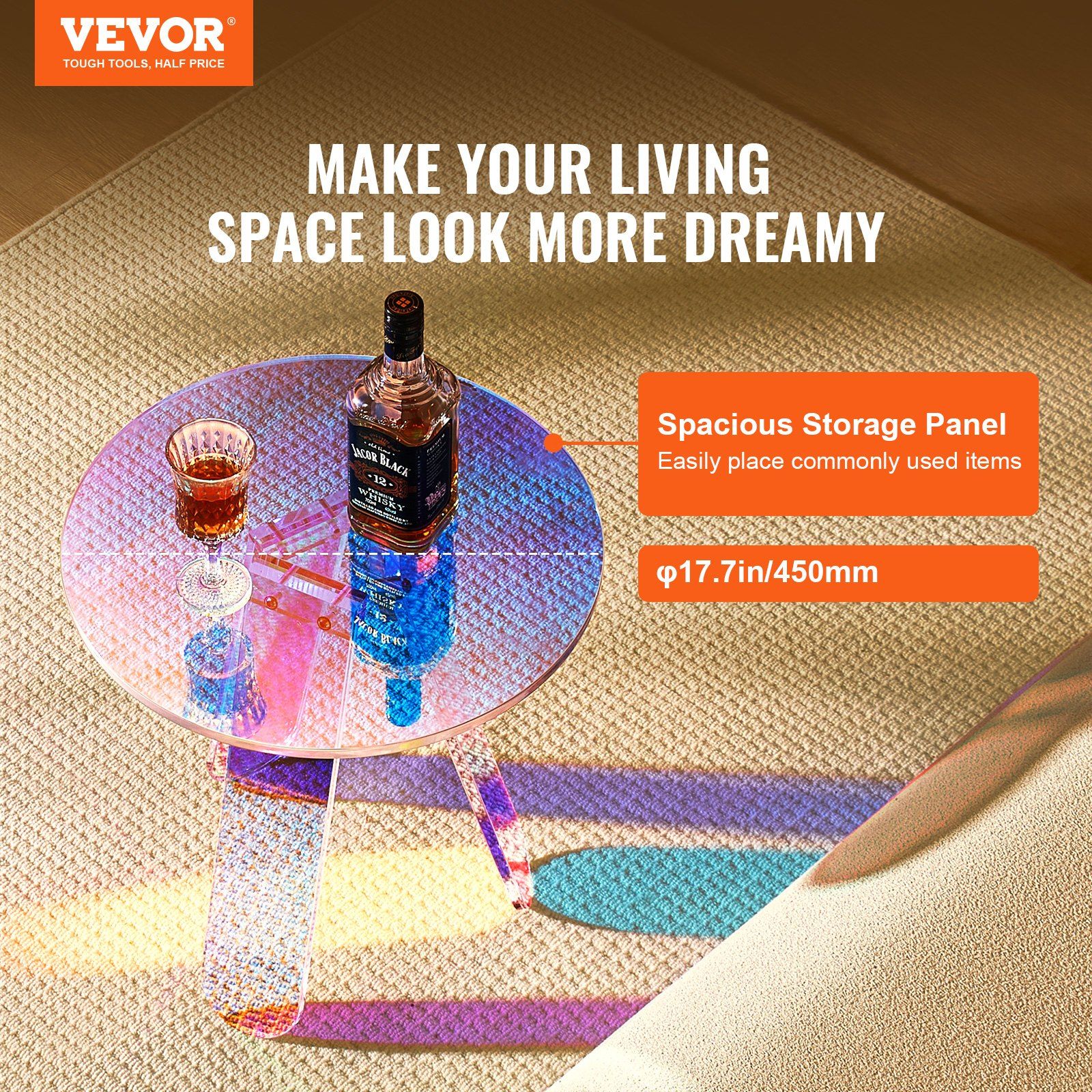 Be the first to review “VEVOR Round Iridescent Side Table, Acrylic End Table, Clear Rainbow Acrylic Coffee Table for Drink, Food, Snack used in Living Room, Bedroom, and Study”
